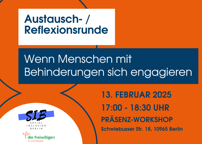 In diesem 1,5-stündigen Workshop lernen wir, wie man inklusives Engagement gestaltet. Gemeinsam mit Erfahrungsexpert*innen sprechen wir darüber, was wichtig ist, damit sich alle in der Freiwilligenarbeit wohlfühlen können. Wir diskutieren über mögliche Schwierigkeiten und wie wir sie überwinden können. Mit praktischen Beispielen und Tipps erfahren die Teilnehmenden, wie sich Angebote für freiwilliges Engagement einfacher und inklusiver gestalten lassen.